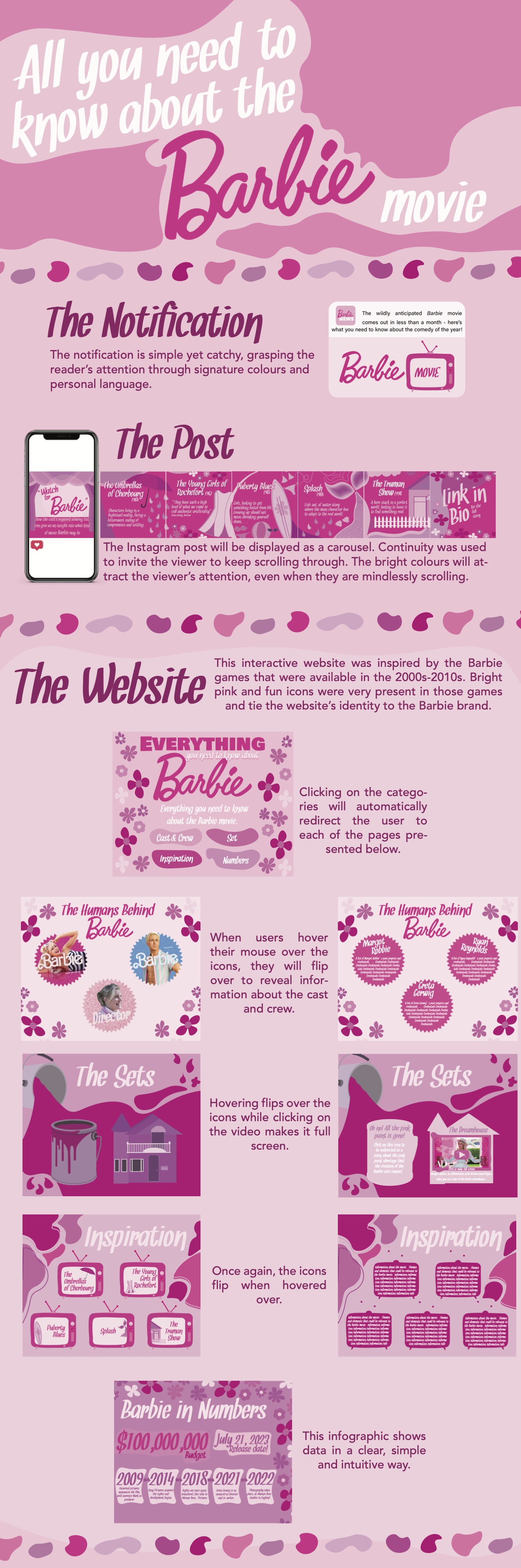 Exercice de conception d’une notification, d’une publication instagram et d’un site web en lien avec le film Barbie, dans le cadre d’un cours de direction artistique. Dessin digital, mise en page et création d’icônes.