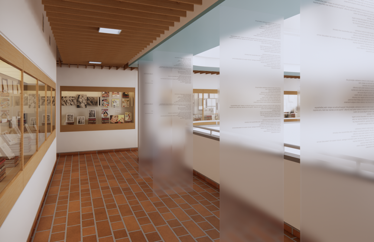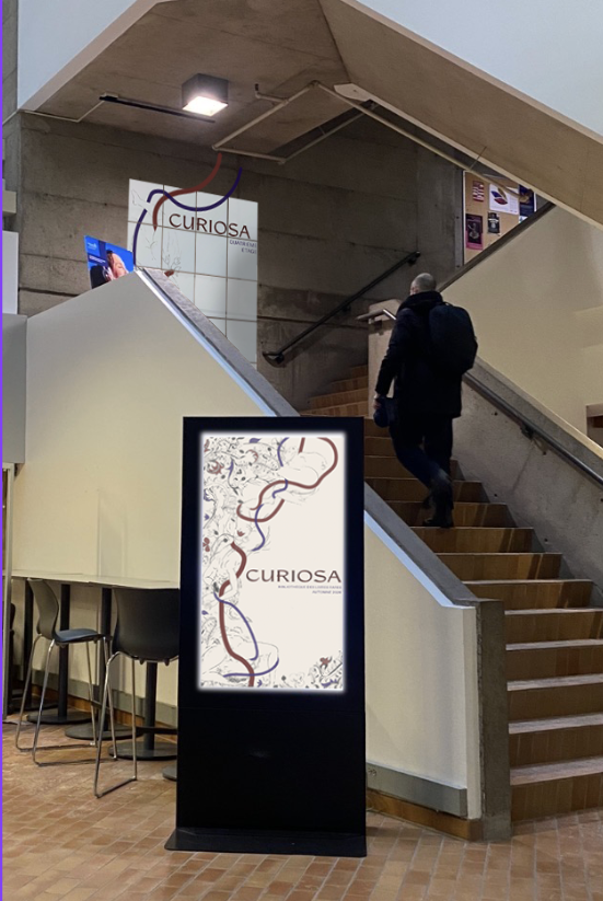 J’ai été responsable de créer l’identité visuelle de l’exposition, que j’ai ensuite appliquée à une publicité sur panneau digital, à un mur de miroirs qui sera placé au premier étage de la bibliothèque pour attirer l’attention des visiteurs, et à un message affiché sur écran digital à l’entrée de l’exposition.