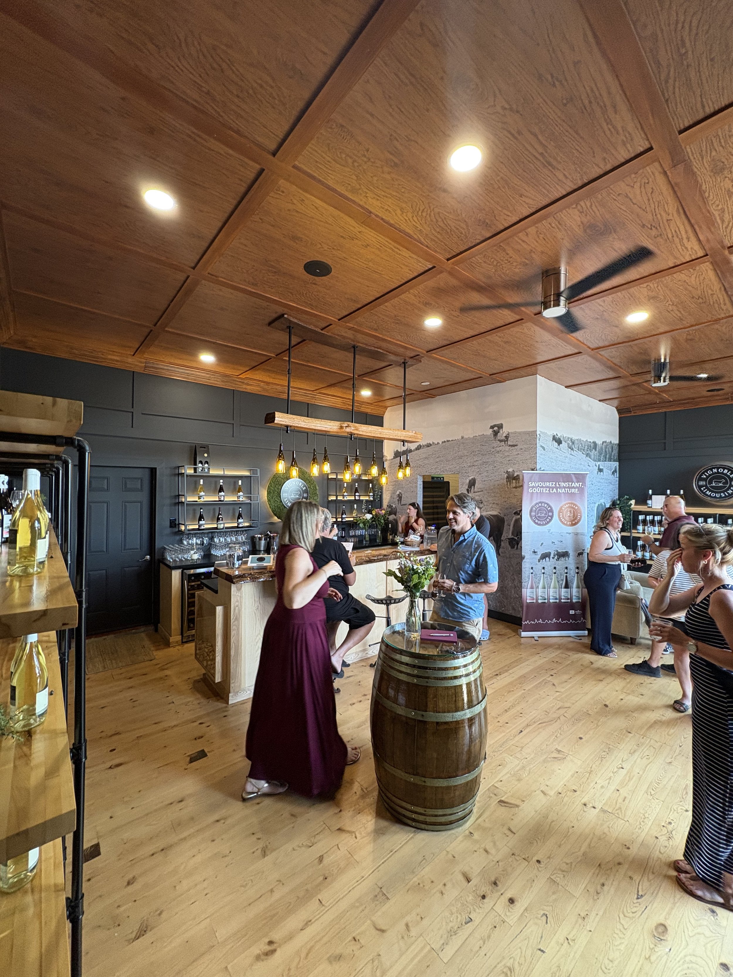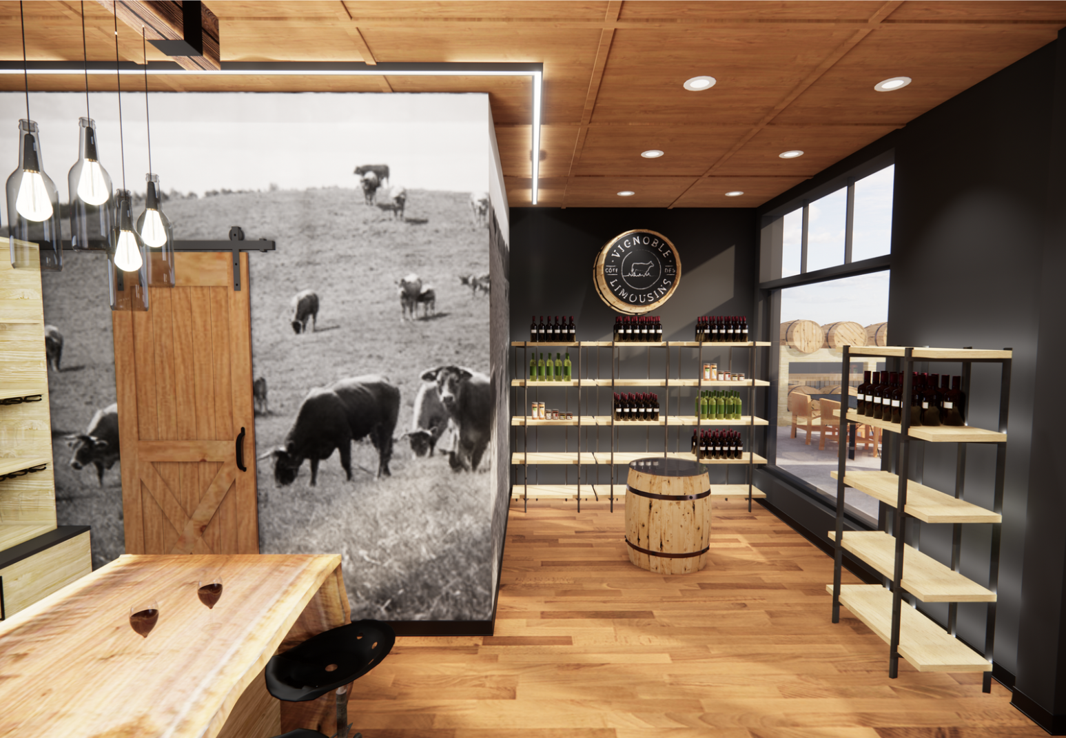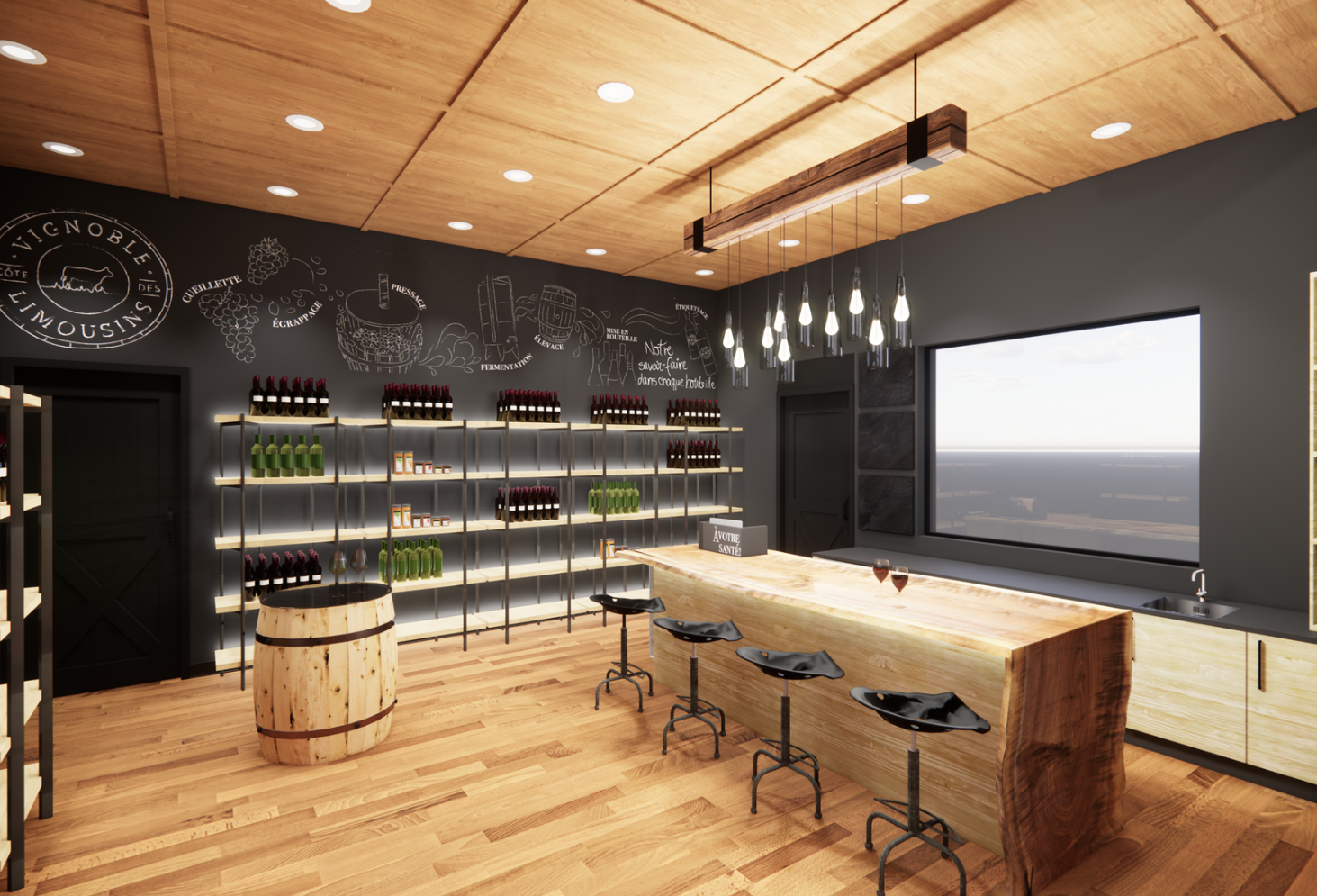 Aménagement de la section boutique du vignoble, avec une emphase sur l’expérience client, la mise en valeur des produits et l’adaptabilité de l’espace selon différents événements.
