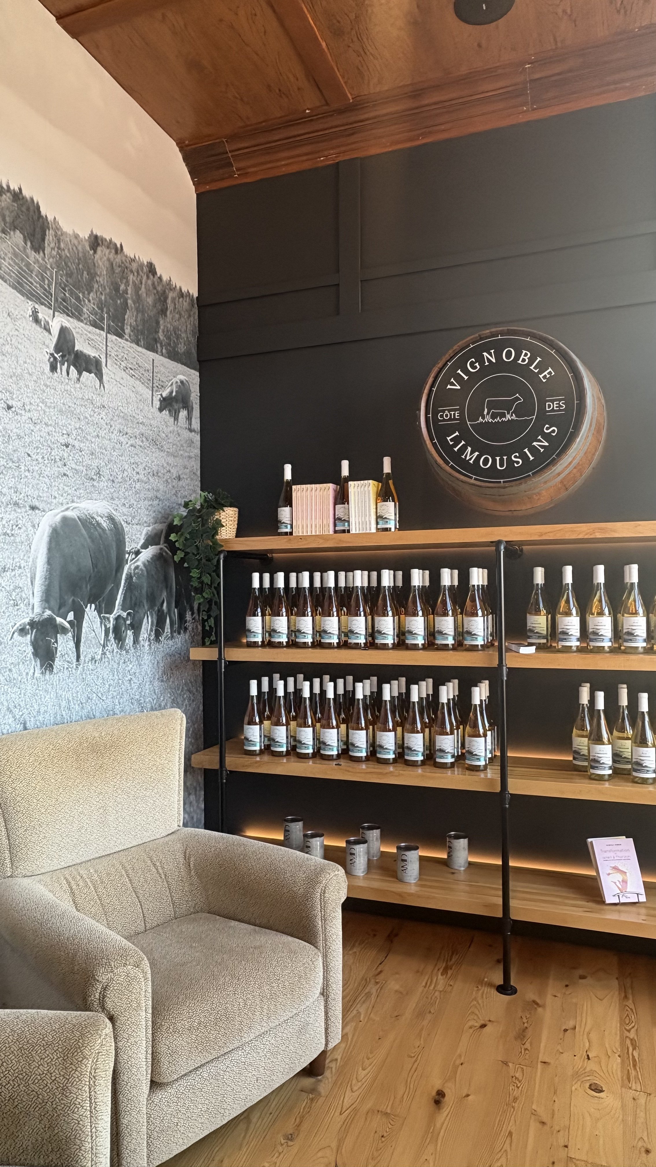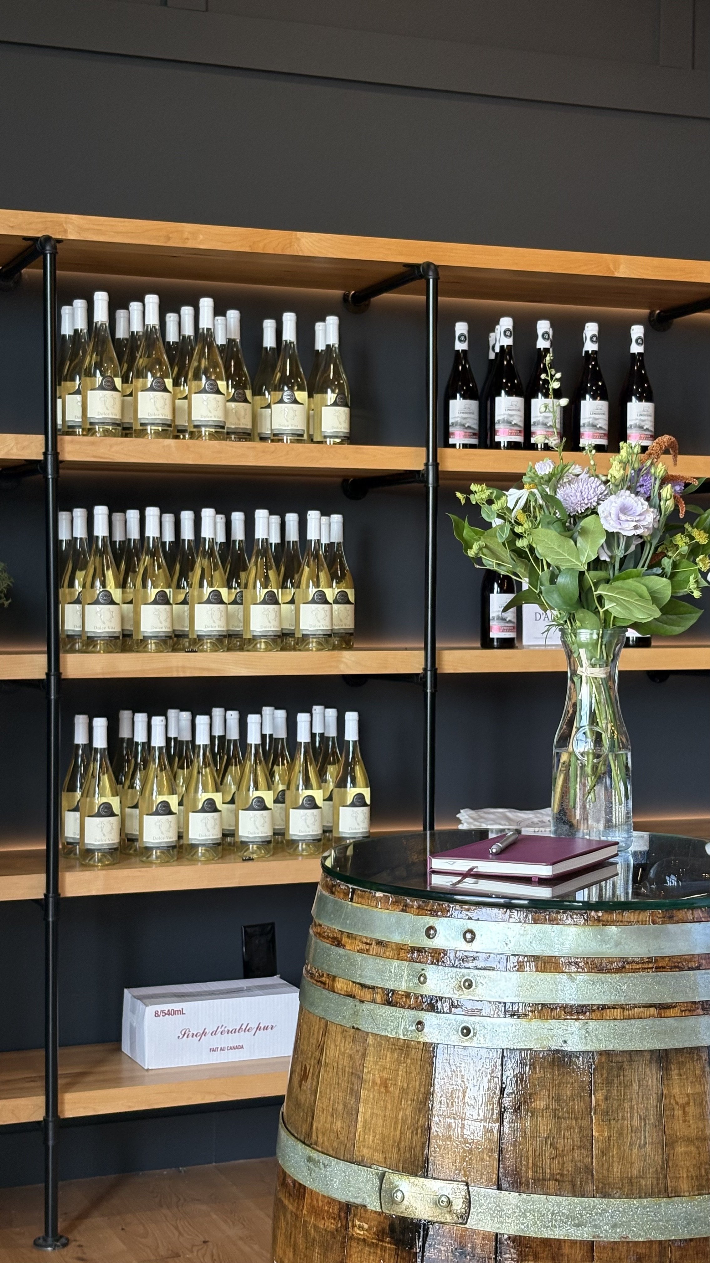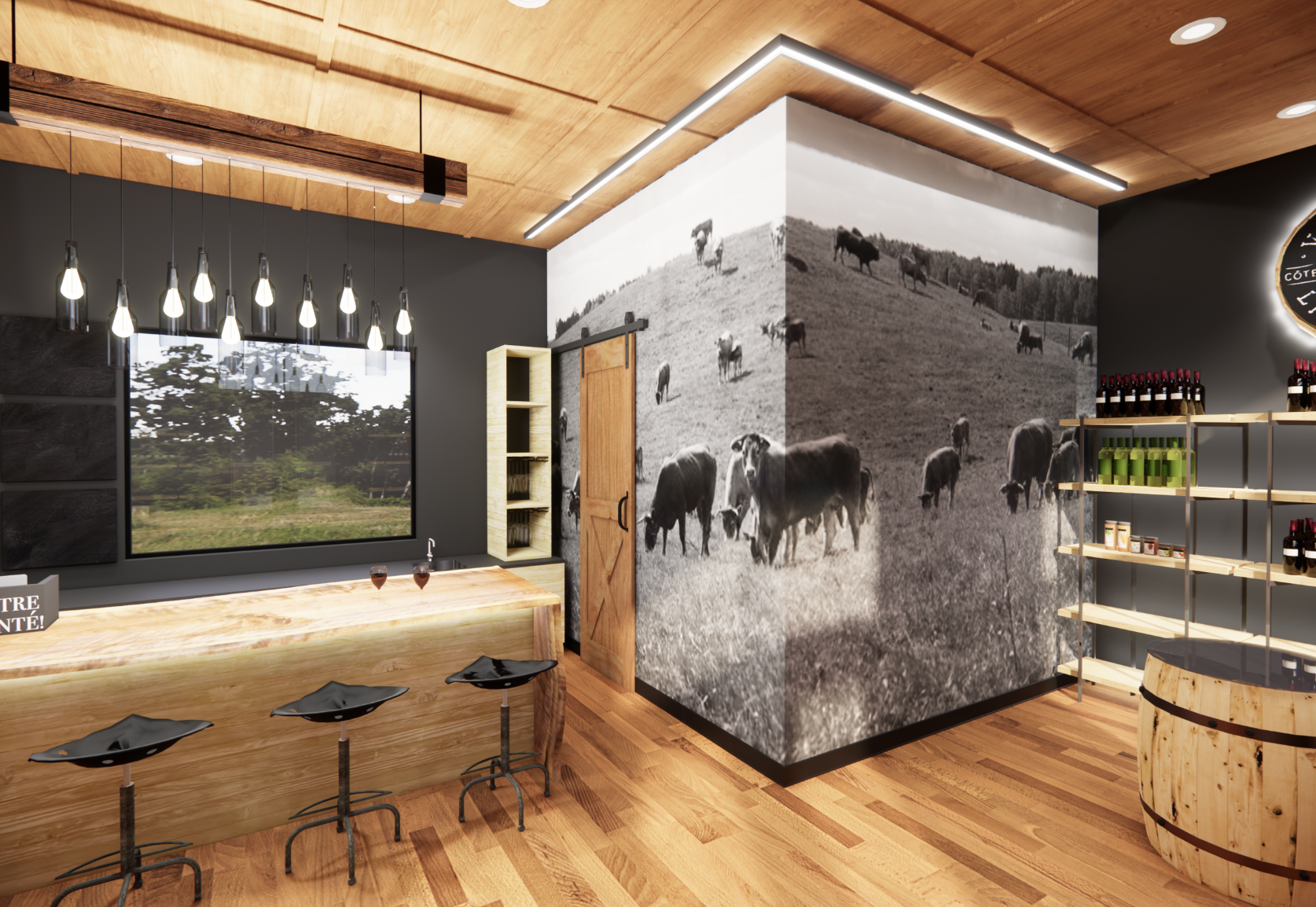Aménagement de la section boutique du vignoble, avec une emphase sur l’expérience client, la mise en valeur des produits et l’adaptabilité de l’espace selon différents événements.